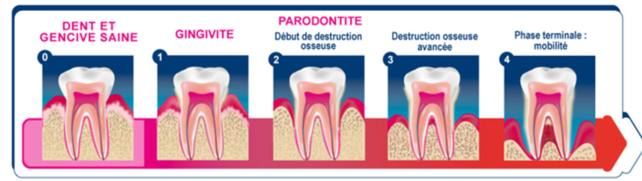 La PARODONTITE : l'inflammation se propage en profondeur, on a une atteinte de toute la structure de soutien de la dent. Cela se traduit par une perte osseuse et une rétraction de la gencive. La maladie peut se stabiliser, mais les pertes sont irréversibles.